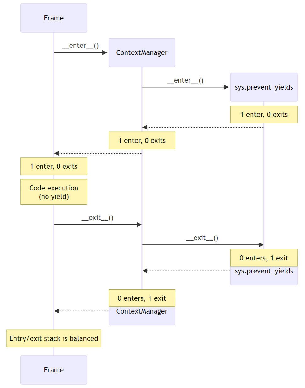 In this example, we see multiple rounds of the stack merging as we unwind from sys.prevent_yields, through the user-defined ContextManager, back to the original Frame. For brevity, the reason for preventing yields is not shown; it is part of the “1 enter” state.